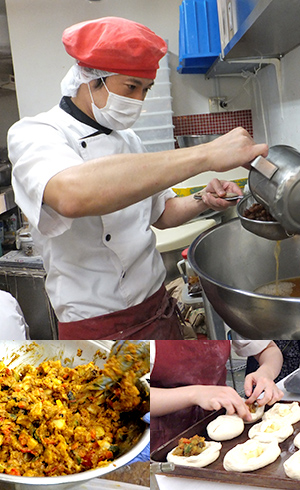 「このカレーパンは、差別化を狙い、高輪という土地に合ったカレーパンはどういうものかを考えて、揚げカレーではなく、敢えて焼きカレーにしました。焼く方が使える具材の幅が広がり、空洞が出ないんです」。たっぷりの自家製フィリングとチーズを載せて、伸びのいい生地で包み込み、焼くことによって味を重ねるのだと朝倉氏。その戦略が見事に当たり、今や平日でも1日400個、休日ともなれば500個は売れる看板商品に育っている。