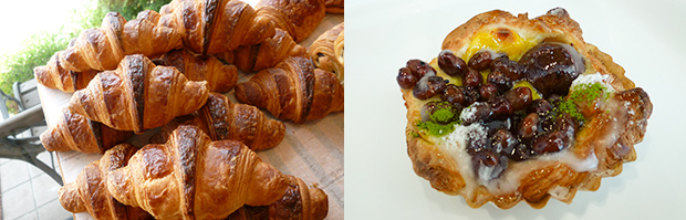大下氏のおすすめはナチュラルチーズ、クリームチーズ、パルメザンチーズなどがたっぷりの「チーズまみれ350円(税抜)」。北海道のよつ葉バター(無塩)のまろやかな風味がやさしい「クロワッサン150円(税抜)」。毎日来てもワクワクできる「日替わりデニッシュ200円(税抜)」など。ちなみにこの日は抹茶とあずきの和風テイストだった。