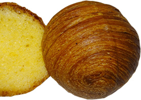 人気メニューを挙げてもらうと、1位はまん丸の形をした「ディモンシュ」150円(税別)という。オーヴェルニュ時代にリスドオルコンテストで準優勝に輝いた商品だ。ブリオッシュ生地をデニッシュ生地で包み、丸い型に入れて焼いたものだが、その形、外側のサックリ、中のふんわりした食感とリッチな味わいが絶品。他にないユニークな商品はまさに長岩シェフのアイデアが光る逸品といえる。