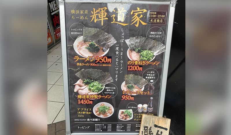 まずは「しょっぱウマい家系ラーメン」で人気の店、「横浜家系らーめん 輝道家 水道橋駅前店」に。