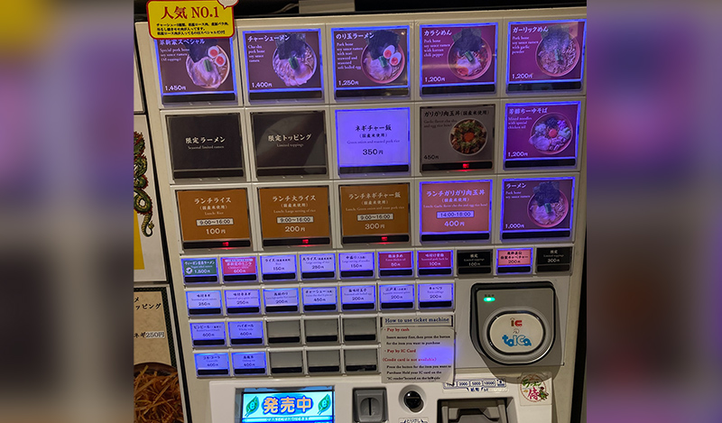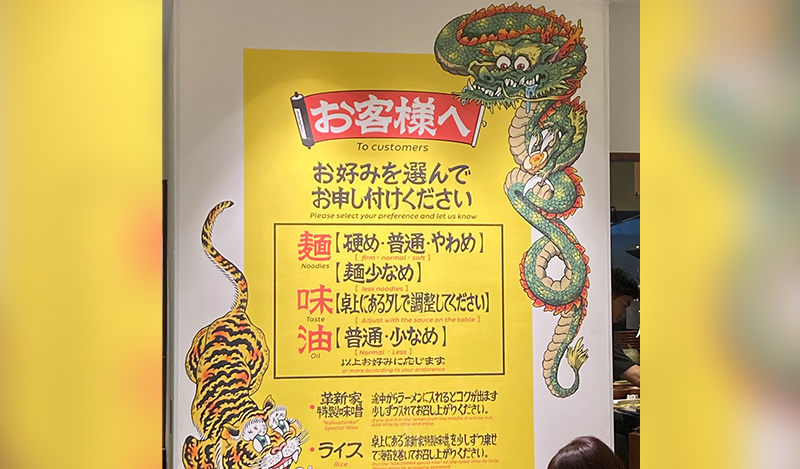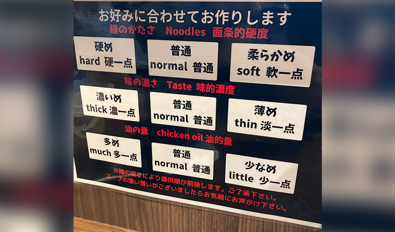 家系ラーメンの特徴である、「麺の硬さ」「味の濃さ」「油の量」を選べる点は、こちらでも共通。インバウンド需要を意識して、英語のキャプションをつける店も増えたが、こちらでは中国語もつけている。