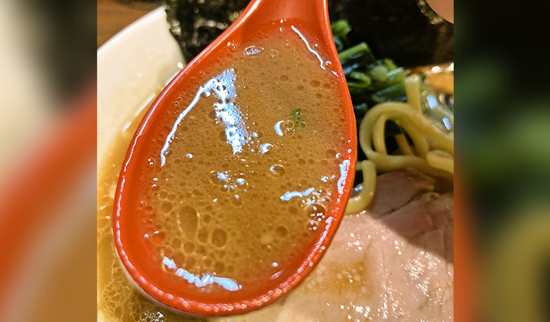 スープには豚のげんこつ・ロース骨・背脂を使用。鶏は熊本の地鶏「天草大王」など、国産の鶏ガラを用いている。滑らかな口当たりで力強く、インパクトがありながら飽きさせない一杯を実現。醤油ダレは家系ラーメンの人気店「ラーメン飛粋」直伝!