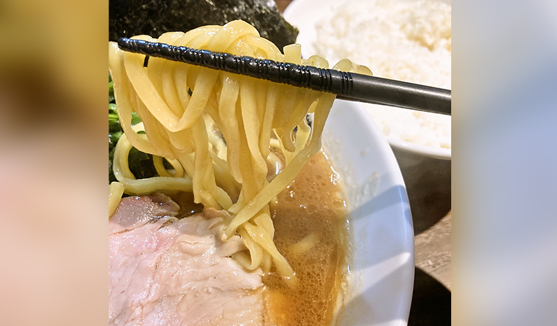 家系ならではの中太麺だが、北海道産小麦の「春よ恋」「ゆめちから」に、熊本県産のもち小麦「モチハルカ」をブレンドした特注麺。モチッと滑らかな食感が、口の中に心地よい食感を残してくれる。