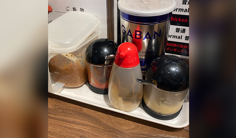 豊富な卓上調味料から、リンゴ酢やラー油などを使い、味変のバリエーションが多いのも嬉しいポイント。