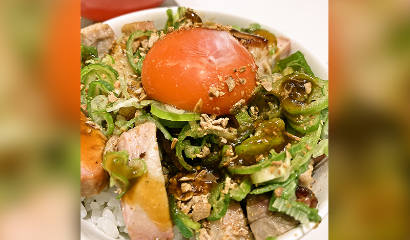 サイドメニューの「ガリガリ肉玉丼」も注文。ニンニクを入れたタレとフライドガーリック、2種類のニンニクを使っていて、フライドガーリックの食感からも感じる「ガリガリ」の名がつけられている。様々な部位の刻みチャーシューと卵黄をかき混ぜて、スープをかけるなどして一気に食べられる。