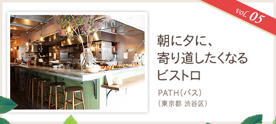 カフェのように軽快な空間で、開店から14時まではパン、焼き菓子やブランチメニューを。18時からはワイン&フランス料理で、軽く1杯からしっかりコース、ドリンクペアリングまで、自由に、気ままに味わうことができる店です。オーナーは、「トロワグロ」でパティシエとして腕を振るった後藤裕一さんとフレンチシェフの原太一さんのお2人。日々の暮らしの中で、ここに立ち寄ってお腹を満たし、ほっと息抜きできるように、そしてフレンチをまだ味わったことのない人にとっては気軽な入り口に……店名の 「PATH」にはそんな想いが込められています。