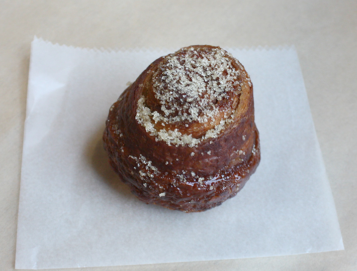 全粒粉を使うことは同店のパンの特長の1つ。クロワッサン生地にも全粒粉を使い、バターの風味だけでなく、小麦の香りと味わいをしっかりと感じることができる。粗びき&パウダー状のカルダモンをたっぷりと巻き込み、レモンピールがさわやかに香る。