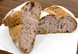 - 葡萄のかすをピューレ状にして、種を除去し生地に練り込むことで、優しい味のパンに仕上がりました。ルヴァン種を少し入れ、クルミとイチジクも入れて食感を出しています。山梨のカンパーニュというイメージですね。