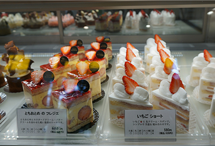 - 「メゾンジブレー」は、入り口の正面が生菓子のショーケースですが、左手にギフト菓子のショーケースがあり、4月頃から夏場は「フルフルジブレー」が主役ですね。様々なフルーツをはじめ、コーヒーゼリーも豆の産地別などのバリエーションを増やし、“旅するコーヒーゼリー”というコンセプトのアソートギフトが出来るほどになっています。