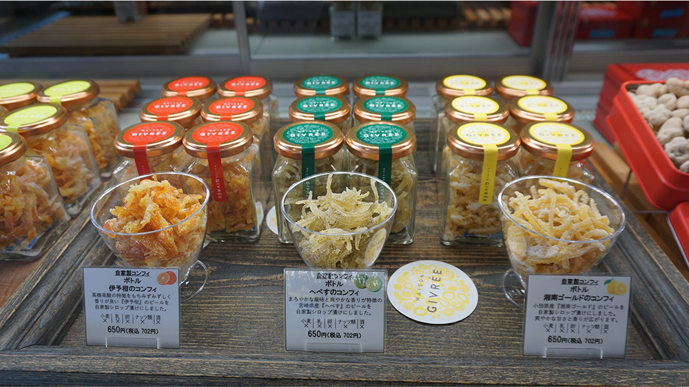 最近は、柑橘類の皮を細切りにしてコンフィにし、砂糖をまぶしたお菓子をボトルに詰めた品がとても好評で、柑橘の品種別にどんどん種類が増えています。ギフトセットの中に入れていただいたり、1瓶でも気軽なプレゼントに使っていただいたり、よく売れています。