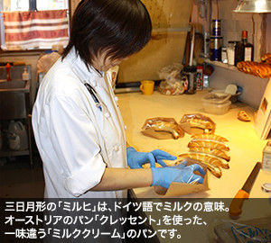 自慢のカスタードクリームを使った「カスタードホーン」は、注文後にクロワッサン生地のホーンにクリームをしぼっています。しぼりたてがいちばんおいしいですから、お客様には「どうぞ気軽にこの場でかぶりついて!」とおすすめしています。