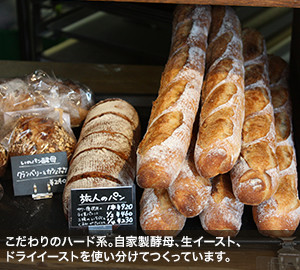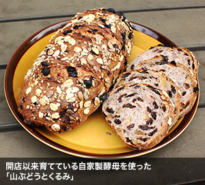 グリーンレーズンから種を起こし、粉をついで、開店以来育てている自家製酵母を使っています。レーズンよりも小粒で甘みの濃い、カレンズとクルミをたっぷり。日がたつにつれて酸味が出るなど、味わいにも変化があります。
