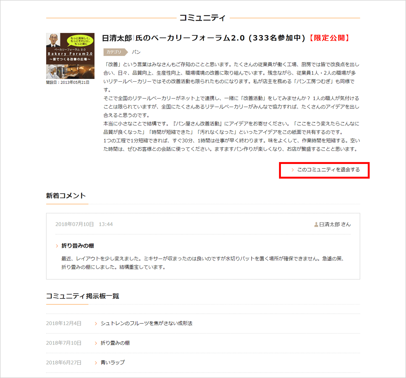 ④初回は「コミュニティサービスに関する特則」にご同意いただいた後、コミュニティへの参加をご確認いただけるページが表示されます(退会する際は、「このコミュニティを退会する」をクリックします)。
