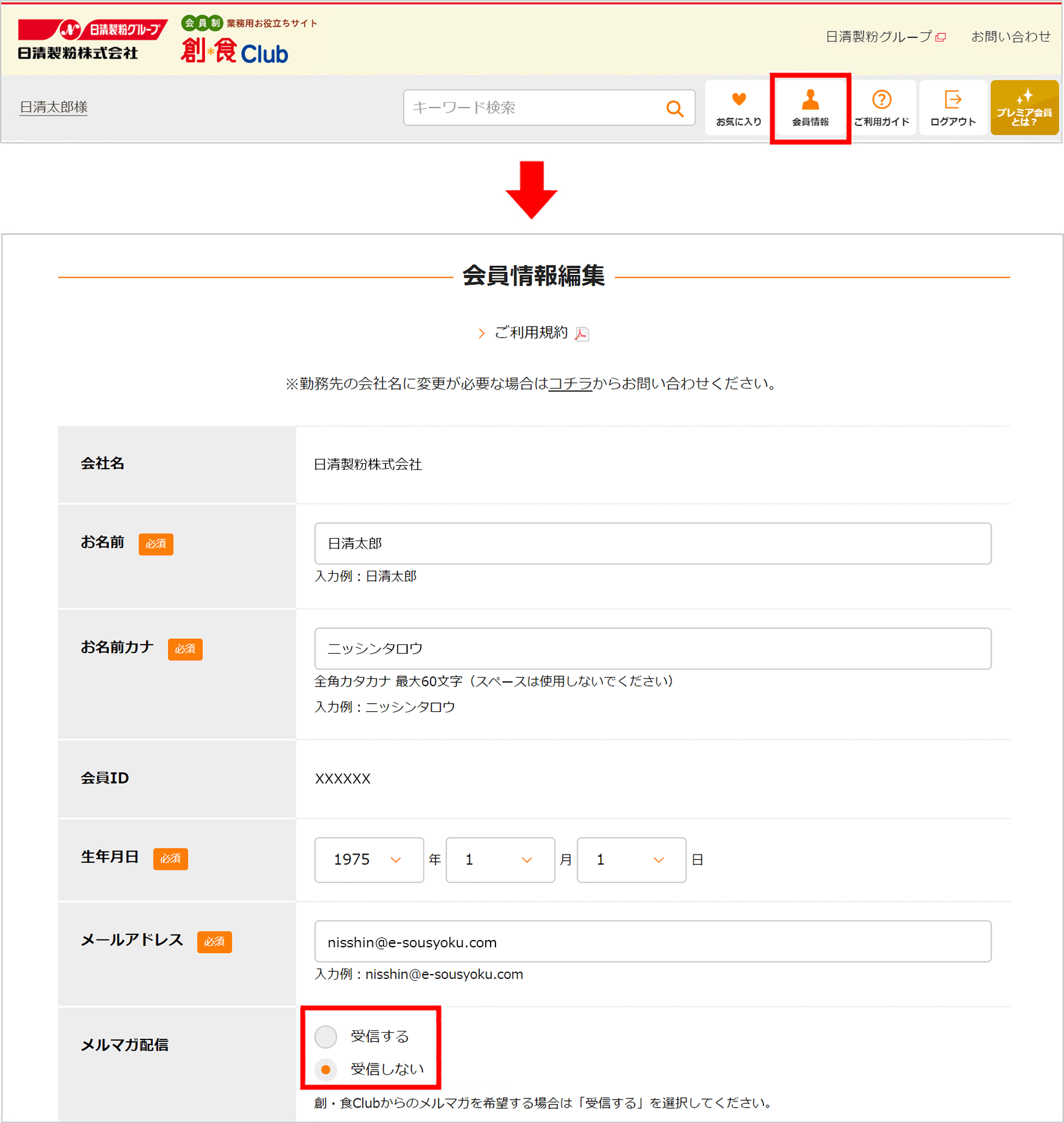 ページ上部の「会員情報」から、会員情報編集画面を開いてください。 メルマガ配信を中止したい方は、「受信しない」にチェックマークを入れます。