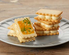 北海道産小麦の菓子用粉「スノーフレーク」を使用した、程よい崩壊感があるソフトで口どけのよいクッキーです。レアチーズケーキ風味の濃厚なクリームと組み合わせ、冷蔵タイプのバターサンドクッキーに仕上げました。