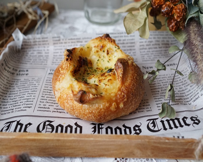 ふんわりとした食事パンにクリーミーなグラタンを合わせています。グラタンはエビの旨味とホワイトソースのクリーミーさが絶妙で、温めて熱々で食べれば心も体も温まる冬にぴったりの一品です。