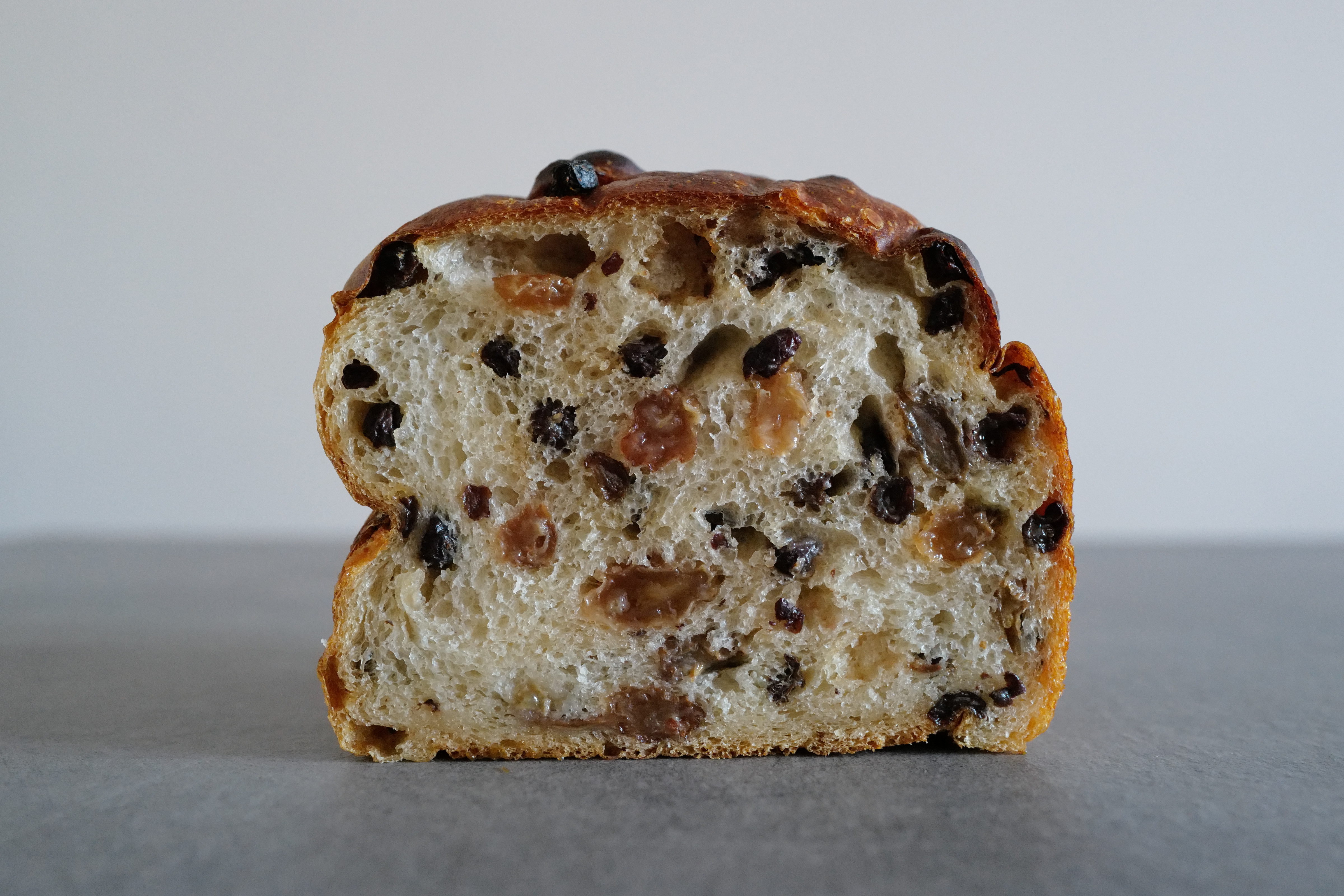 その魅力は、他店舗では味わえないジューシーさにあります。多加水のしっとりとした生地に練り込まれるのは、サルタナレーズン60%とカレンズ40%という絶妙な黄金比。サルタナの甘みとカレンズの濃厚な酸味が織りなすハーモニーは、一口ごとに感動を呼び起こします。