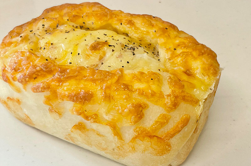 米粉入りの生地に、4種のチーズ(ゴーダ、レッドチェダー、スモークチーズ、サムソー)を巻き込んだお食事パンです。もっちりかつしっとりとしたやわらかい生地に、たっぷりとチーズが入っていました。少し温めてから食べるとチーズの風味がアップし、香ばしいです。ブラックペッパーのピリッとした辛さがアクセントになっています。ボリュームがありますが、重たくないのでぺろりと食べられますよ。