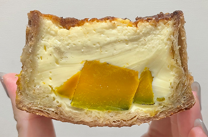 岩手県北上市の坊ちゃんかぼちゃと淡路島の玉ねぎをじっくり火入れしていて、野菜の素材の甘みが感じられます。そこにクリーミーでほんのり塩気のあるゴルゴンゾーラチーズがアクセントになっています。生地は香ばしく、中身と一体化していて、ずっしりとしていてボリュームがあり、満足感も十分。