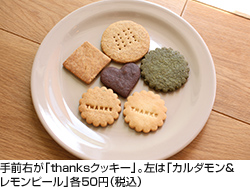 一番人気の「thanksクッキー」は、アーモンドパウダー入りのサクサクとしたサブレっぽい食感で、小さなクッキー生地1枚ずつにthanksの文字がスタンプされています。