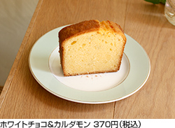 「ホワイトチョコとカルダモンのケーキ」は、パウンドケーキをアレンジして、ミルクのほかにヨーグルトも入れて、よりしっとり感のある生地がベース。これに溶かしたホワイトチョコレートを型1本に230gくらい、たっぷり練り込んであります。「アクセントにカルダモンのホールを粗く挽いて混ぜています。ホワイトチョコレートのとてもミルキーなテイストに、カルダモンが爽やかさを加え、ひきしめる役割も。スパイスはパウダーで使うよりも、粒のほうが、口の中で弾けて香りの立ち方が断然違ってくるんです」(堀さん)。