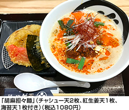 「天丼らぁ麺ハゲ天」で提供する天丼は、「天丼」(980円)、「天丼(上)」(1230円)、「かき揚げ天丼」(1080円)、「野菜天丼」(850円)の4種類。ラーメンは、「胡麻豚骨らぁ麺」(980円)と「胡麻担々麺」(1080円)の2種類。麺単品の場合、トッピングとしてチャシュー天2枚、紅生姜天1枚、海苔天1枚が付いてきます。