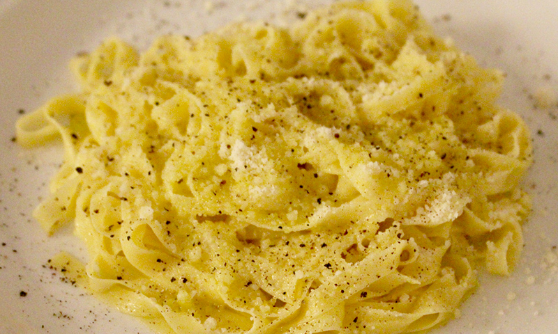「『タリアテッレ』の味付けはパルミジャーノ・チーズ、コショウ、オリーブオイルのみ。美味しいか・美味しくないかということ以上に、パスタの食感、柔らかさを感じ取ってほしいですね。気温や水分の含有率で違いはありますが、食べ頃はつくってから5日以降。小麦粉の外皮が酸化して麺に黒い点々が出てきたときが頃合いです」