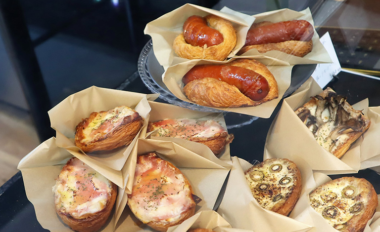 デニッシュ生地は3つ折り3回でサクサク感を際立たせるのが基本的ですが、「チョリソ」、「グリーンオリーブ黒胡椒」や「クロックムッシュ」などの総菜系は、折り方と焼き方を変えて生地のボリューム感を出しているそう。