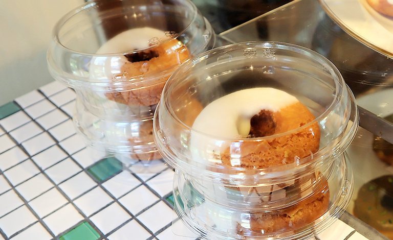 そして、手土産の需要に合わせて、持ち帰り用のパッケージにも工夫があります。ドーナツの姿をそのまま見せてくれる1個用のプラスチックケースは、プチギフトにぴったり。また、4個入り紙箱のラッピングは、1枚の厚紙を書類ファイル用のクリップで留めただけのもの。持ち運び用のショップバッグを兼ねて、見た目はスタイリッシュ、開封や後片付けを簡単にする利便性があります。