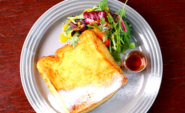 たとえば人気メニューの「フレンチトースト」は、4枚切り厚さの角食を使い、卵やミルク、バターでバランスよくエネルギーを補給できる、アスリートにもおすすめのフードです。