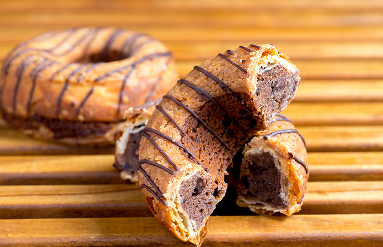 「チョコクロ ロンロン」は、パティスリーで大人気の「ロンロン」というベイクドドーナツをアレンジした、ブーランジュリーならではのアイテムです。ショコラダマンドにチョコチップを混ぜた生地の周りをクロワッサン生地で包んでいます。こちらは焼き上げてから急速冷凍した状態でのお届けです。冷凍庫から出して5~10分くらいで食べごろに。少し冷たい状態でもおいしく召しあがっていただけます。