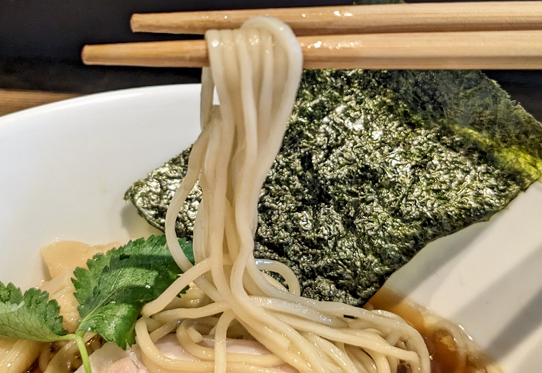 スープは煮干しを使ったスッキリ&シンプルな味わい。10層のスープに20種類ほどの醤油と塩などでつくったタレを合わせることで、優しく奥行きのある味わいが生まれます。