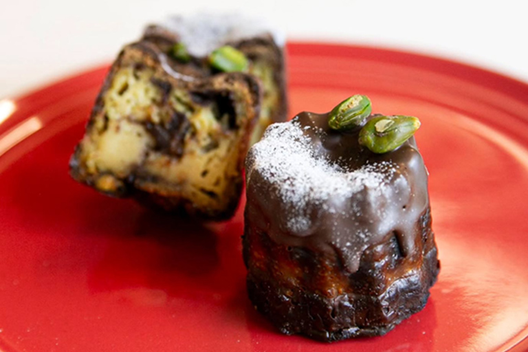 クラシックな「カヌレ」のほか、ヴァローナのチョコレートとホールのピスタチオを生地にもトッピングにも贅沢に使った「カヌレショコラピスタッキオ」、焼き上げたカヌレに生クリームをたっぷり絞った「生カヌレ」もあります。