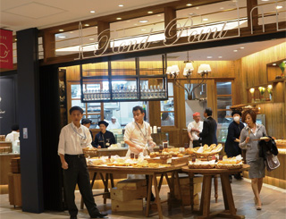 JR東京駅地下から入ると有楽町方面、東京ビルの飲食店街へつながる通路の一番奥に位置しています。通路の幅は4m位の広さが有り、常に人が歩いています。その通路がちょうど150度位に曲がった所の両側に売り場を設けています。奥側にはクロカントだけを5~6mの棚に盛り、東京の新しいお土産としてアピールしています。手前のメインの売り場は中央に大きな平台を置き、65cmもある焼きたてソフトフランスを「どうぞ見てください」と堂々と並べています。壁周りの棚には小物類を並べ、お客様からよく見える様に陳列しています。レジはメイン売り場の奥側に有り、後方はガラス張りの工場で、手作りでパンが作られていくのが、お客からよく見える様にレイアウトされています。お客様が入りやすい動線を確保しているので、お客様は自然に店内に吸い込まれるようです。通路が曲がっていることも歩くスピードを緩め、お店が目にとまる様になっています。
