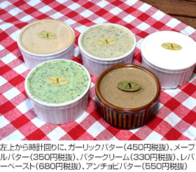 それぞれの特徴は「全て当店のオリジナルで、メープルバターは甘くてコクがあります。ガーリックバターとアンチョビバターはパンに塗ってオードブルとして召し上がっていただけると嬉しいですね」(西條さん)