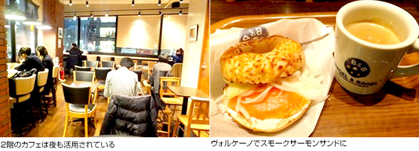 ここはカフェも併設、好みのベーグルでサンドイッチをオーダーできます。人気のヴォルケーノでスモークサーモン&クリームチーズをオーダー。トーストしたモチモチのベーグルとスモークサーモン・クリームチーズ、オニオンがマッチ、ベーグルサンドの魅力を堪能できます。コーヒーは小川珈琲の豆を使用するなど、素材と美味しさにこだわっているからこそでしょう。近隣のOLや学生に愛される繁盛店となっています。