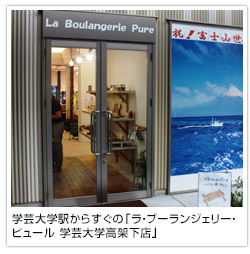 オーナーブーランジェ梶原利之さんによるラ・ブランジェリー・ピュールの2号店。駅の高架下にある便利なロケーションで、売り場はコンパクトながら、壁面にはハード系、ドイツパン、食パンなどが並び、ショーケースには惣菜パンや菓子パンなどバリエーションが豊富。徒歩4分ほどの本店から焼きたてのパンが届けられます。
