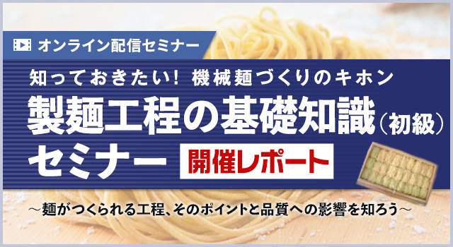 2022年8月4日(木)に知っておきたい!機械麺づくりのキホン 製麺工程の基礎知識(初級)セミナー を開催いたしました。一般的な製麺工程および製麺理論を通じて製麺の基礎知識を習得いただけるよう、また、製麺理論や共通用語を知ることで、経験の浅い方にはベースづくりを、ベテランの方にはそのベースを共有しやすくなるよう、内容を盛り込みました。